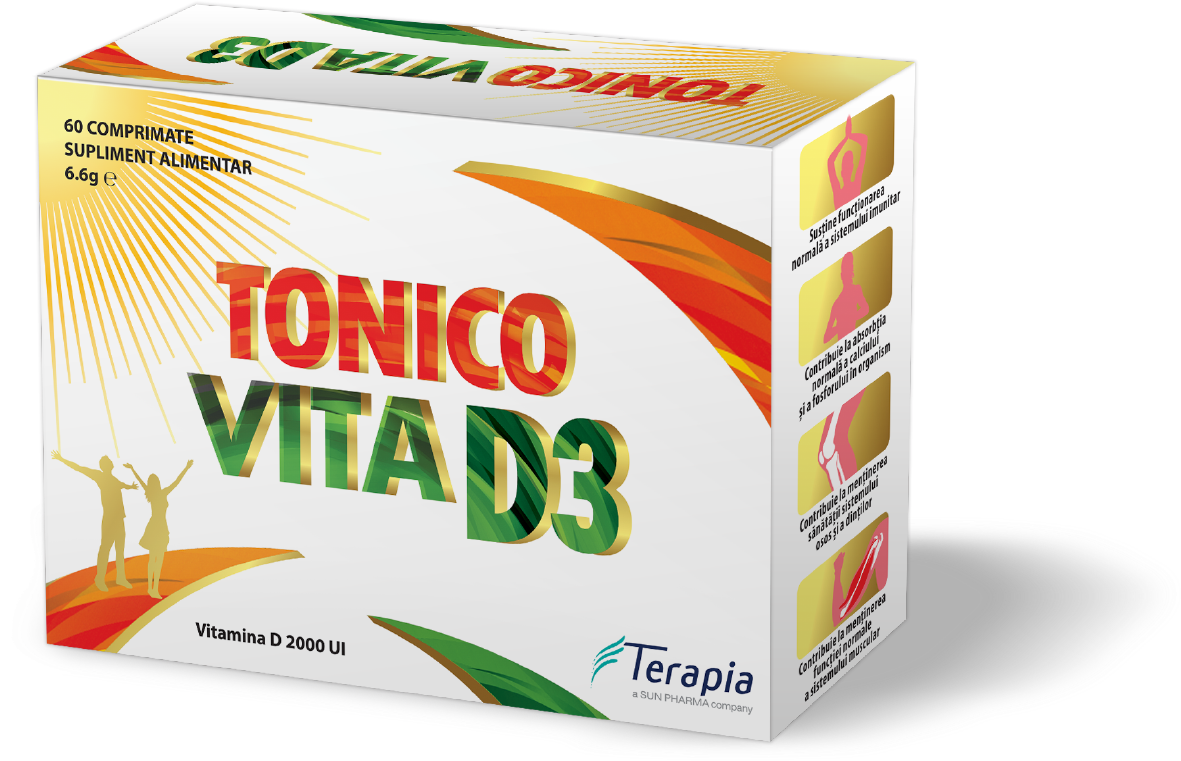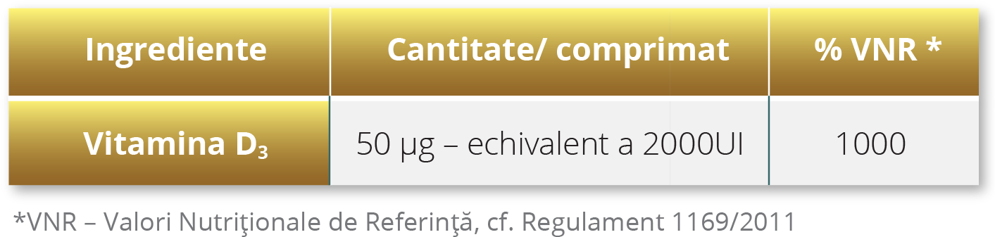 Conţine doza optimă de 2000 UI Vitamina D3/ comprimat: